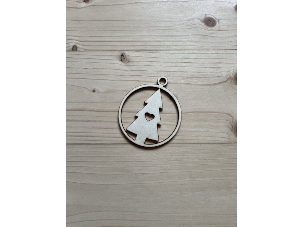 Minimalistická vánoční ozdoba z topolové překližky s motivem stromku v kruhu.