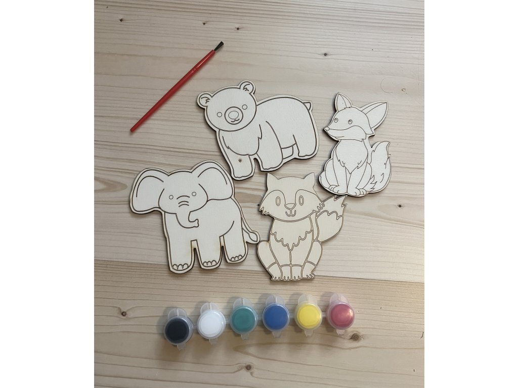 V balení najdete 4x dřevěný výřez zvířátka, sadu šesti akrylových barev a štětec – vše připravené k okamžitému malování.